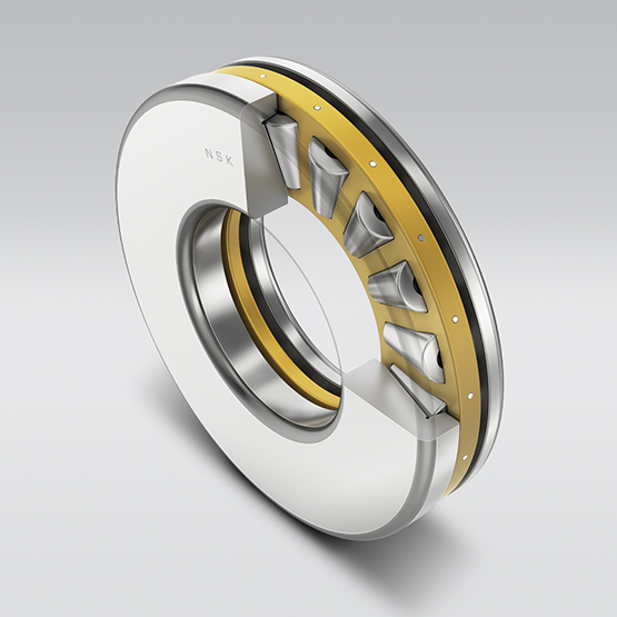 Available with cylindrical, tapered, and spherical rollers, thrust roller bearings sustain only axial loads. NSK’s thrust roller bearings are suitable for heavy loads and offer high axial rigidity. Machined brass cages are used as standard.
