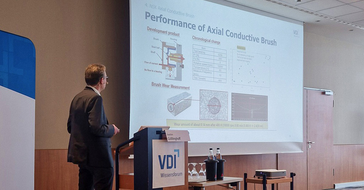 NSK presented at VDI Conference in Aachen, Germany “Asking yourself how to reliably conduct current in an oil #environment? Her is the answer: NSK has developed an innovative Axial Conductive Brush, consisting of two sub-assembly parts, which can complementary be used with any insulated bearing, like the NSK plastic overmolded #bearings. This combination is also required to prevent electrical erosion failures at non-insulated bearing positions, especially in case of a circulating current. The essential feature of the #NSK axial conductive brush is the stable function even in oil-lubricated conditions, compared to existing radial brush solutions, which are stable in dry conditions only. In case of not sufficient space available for the Axial Conductive Brush solution, NSK-Warner, a longstanding NSK-joint venture with Borg Warner, is also able to offer an Electrical Bypass Plate (Conductive Paper) solution, which is also based on an axial contact, but not located at the axis center line as it is for the Axial Conductive Brush, the latter with the big advantage of nearly no peripheral speed in the contact area. When interested in the above and our new NSK product, please don't hesitate to contact Dipl.-Ing. Joachim Gößlinghoff from NSK Europe goesslinghoff-j@nsk.com. He is Engineering Manager Powertrain and presented the NSK Axial Conductive Brush at the VDI Tagung Schadensmechanismen an Lagern 2024 in Aachen.