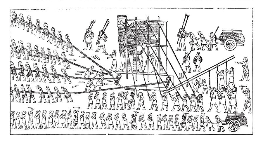 エジプトと並んで都市文明を開花させた古代メソポタミアのレリーフにベアリングの原理が描かれています。建造物を作るためには巨石や石像の運搬が必要ですが、大きくて重い資材の運搬は容易ではありません。そこで、資材の下に丸太を敷き、その上を転がすことで大きな摩擦力を低減し、資材の運搬を可能としました。これはまさしく「転がり接触」です。この原理を利用し、ピラミッドなど現代に残る遺跡の数々が生み出されました。